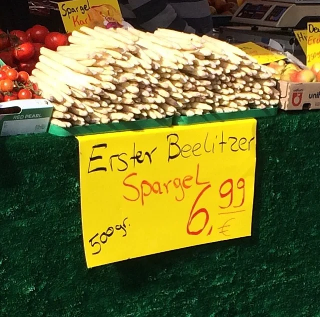 White spargel is king here and far superior to their green brothers and a revered crop comes every year grown in a place called Beelitz found in the surrounding county of Brandenburg around Berlin. When you see that 'erste Beelitzer spargel' sign (first Beelitz asparagus) at the market, you know there is going to be an asparagus frenzy. There will even be signs giving warning when just a few days remain of the season to buy your spargel.